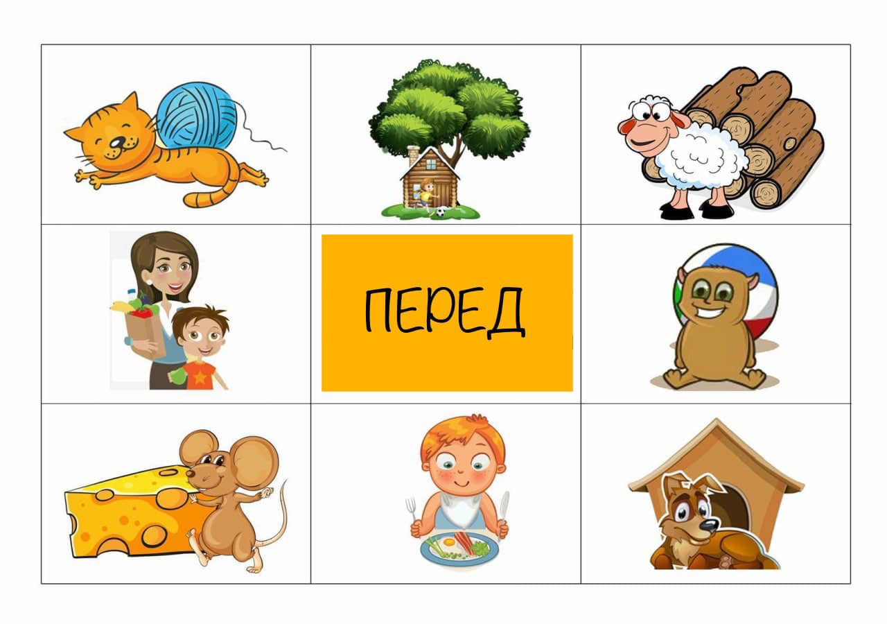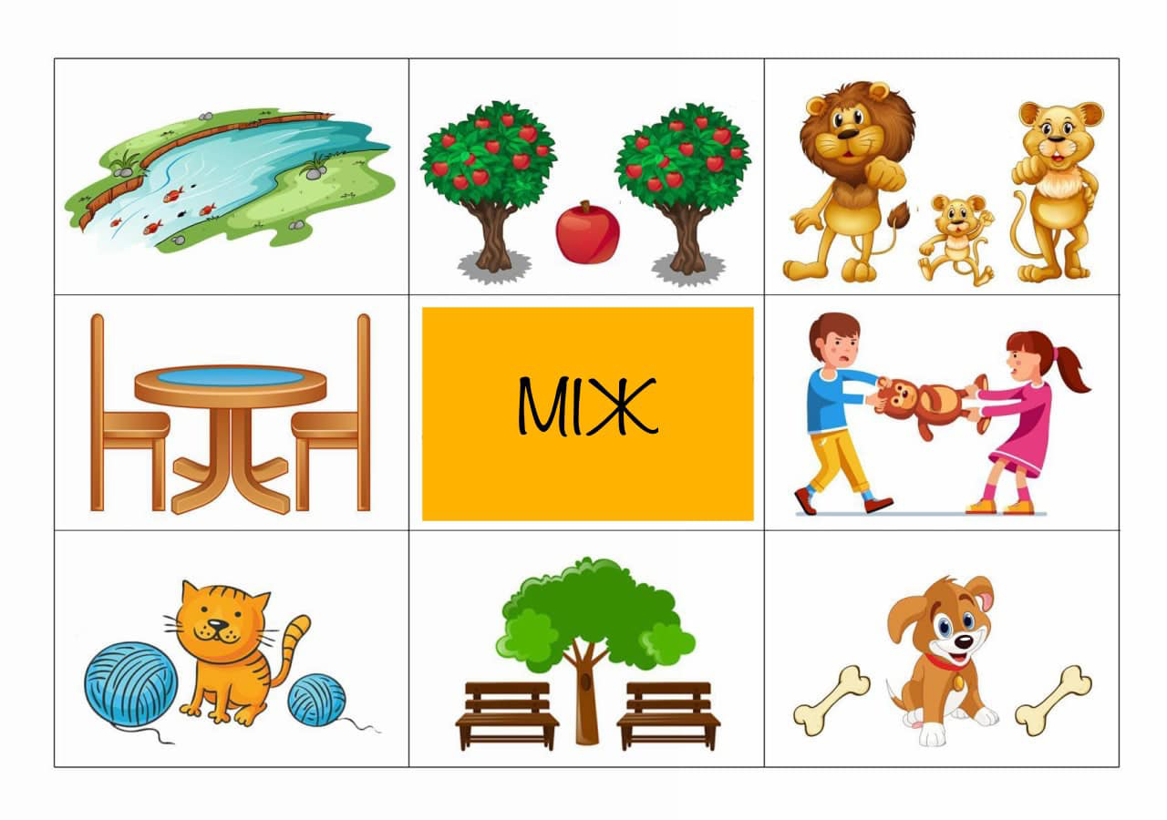 Запропонуйте дитині розглянути картинки та розказати що/хто де знаходиться використовуючи слова В/У, ПЕРЕД, ЗА, БІЛЯ, МІЖ, НАД.