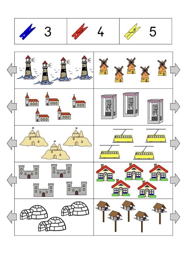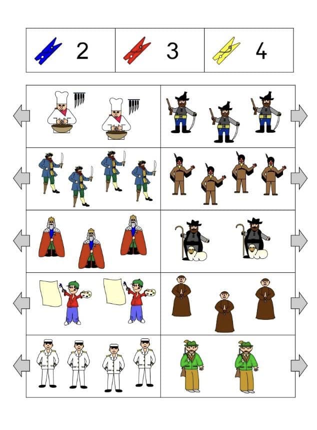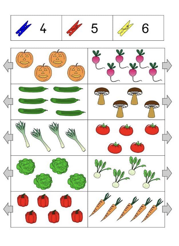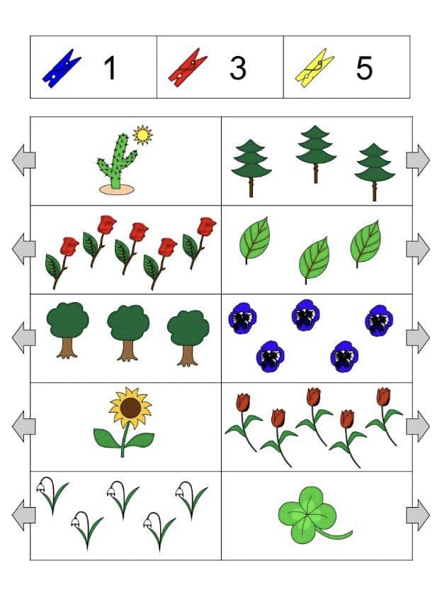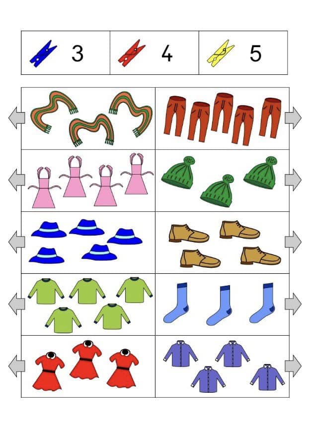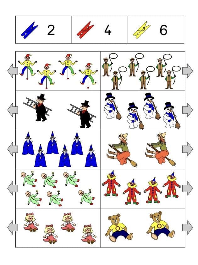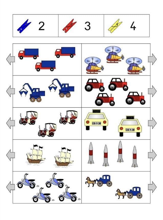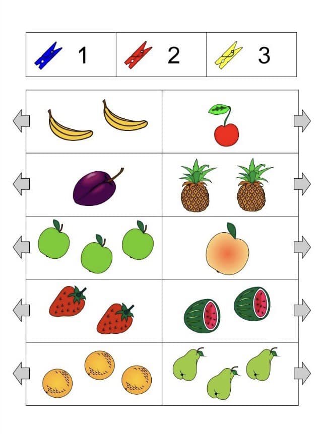 Запропонуйте дитині порахувати малюнки та прикріпити поряд з ними прищіпку відповідного кольору. Поширити