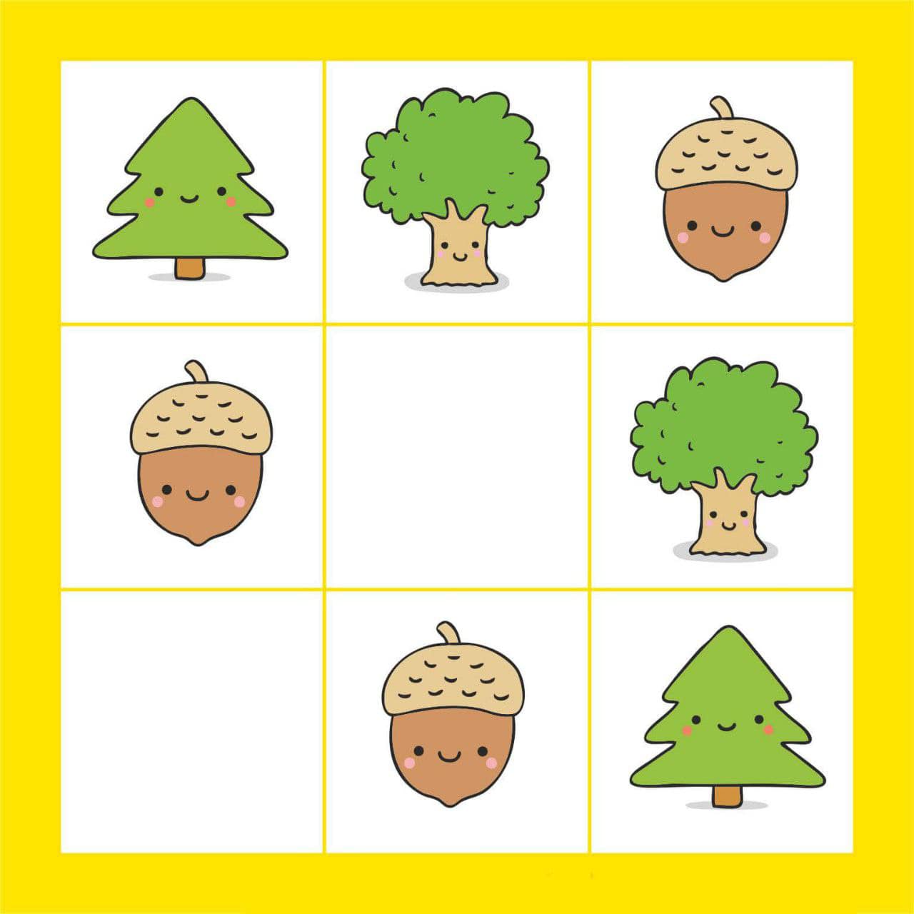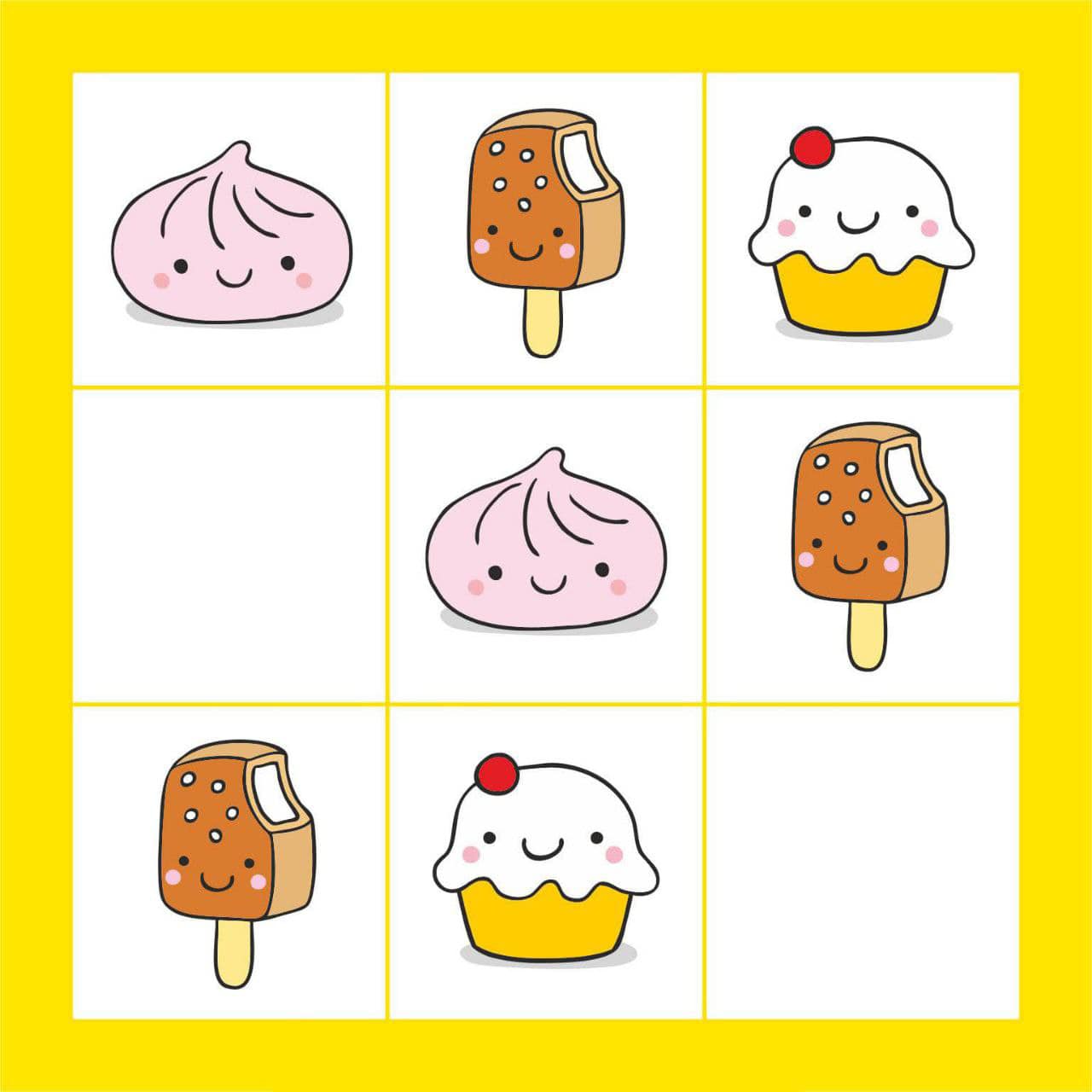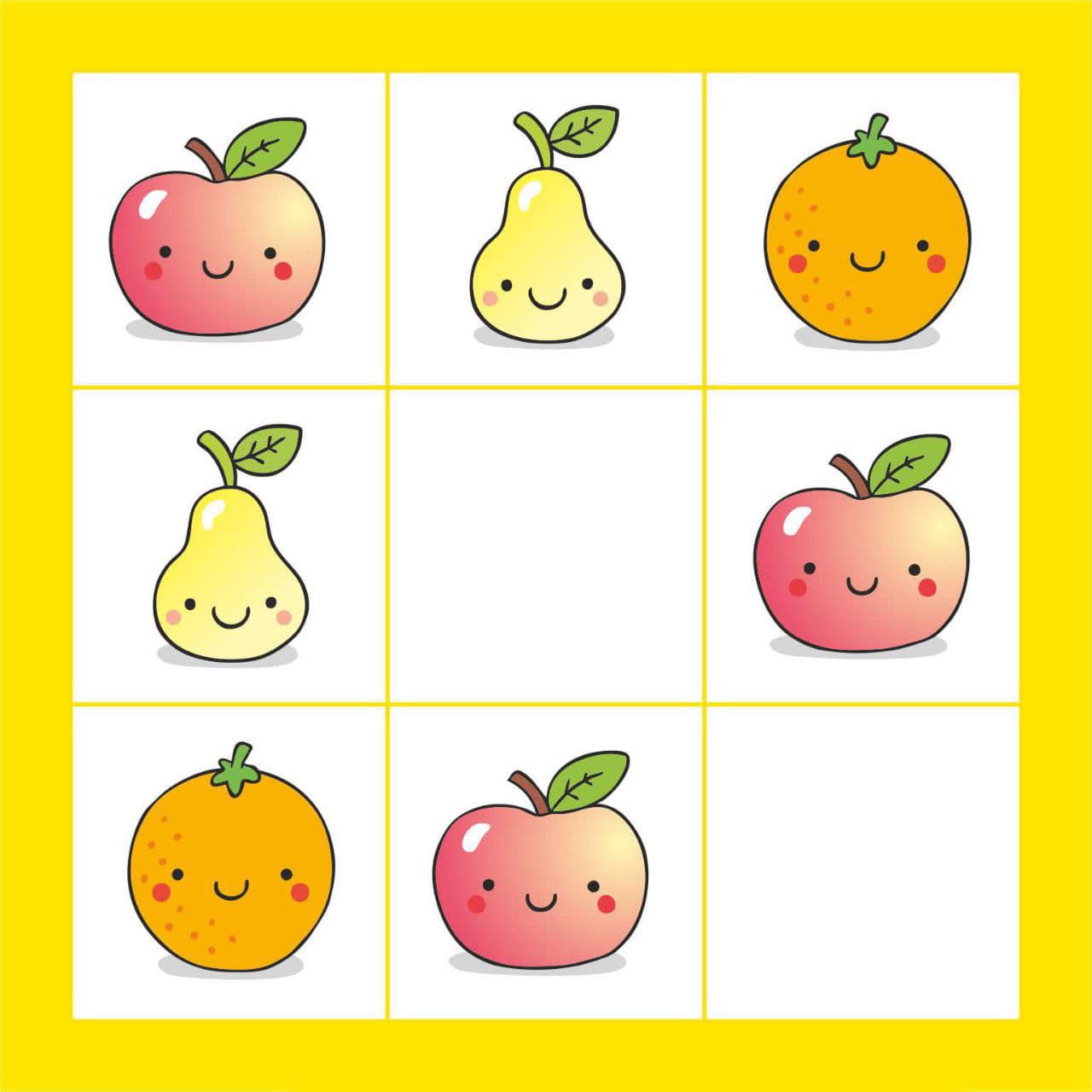 Логічні квадрати, розвиток мислення, уваги. Запропонуйте дитині заповнити порожні клітинки. Перед виконанням завдання зверніть увагу дитини на верхній рядок та поясніть, що в кожному рядку та стовпчику мають бути різні картинки. Поширити