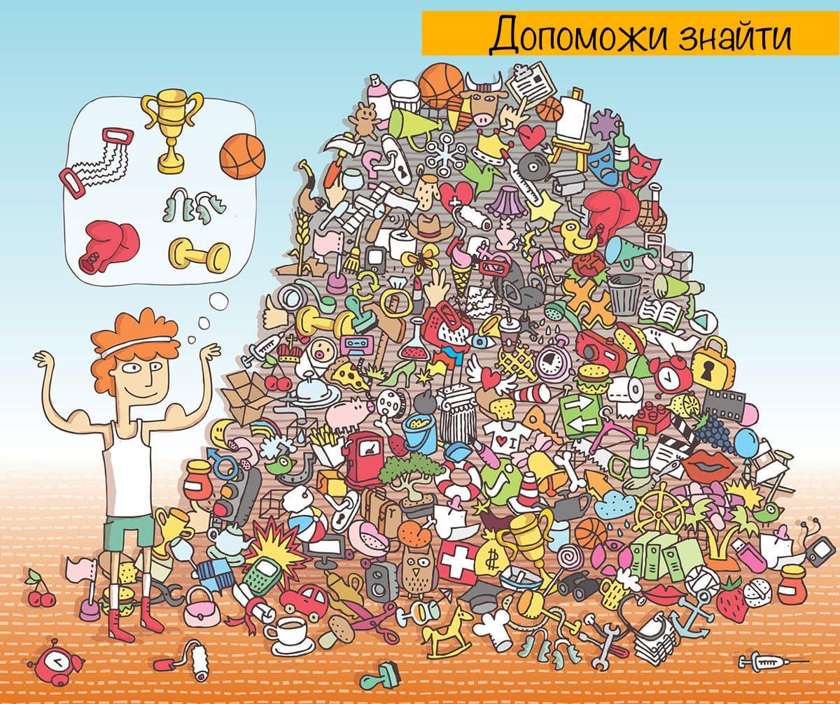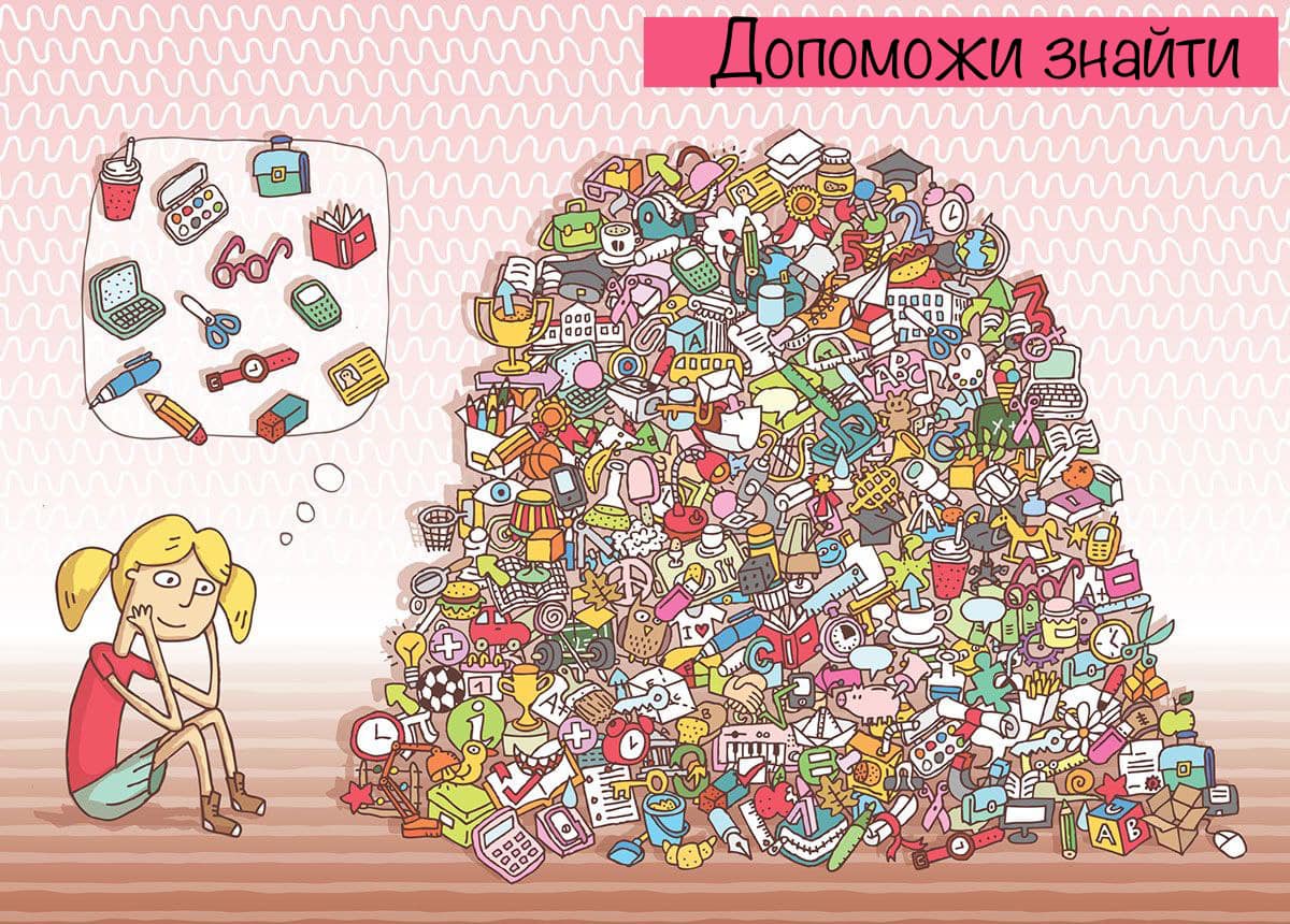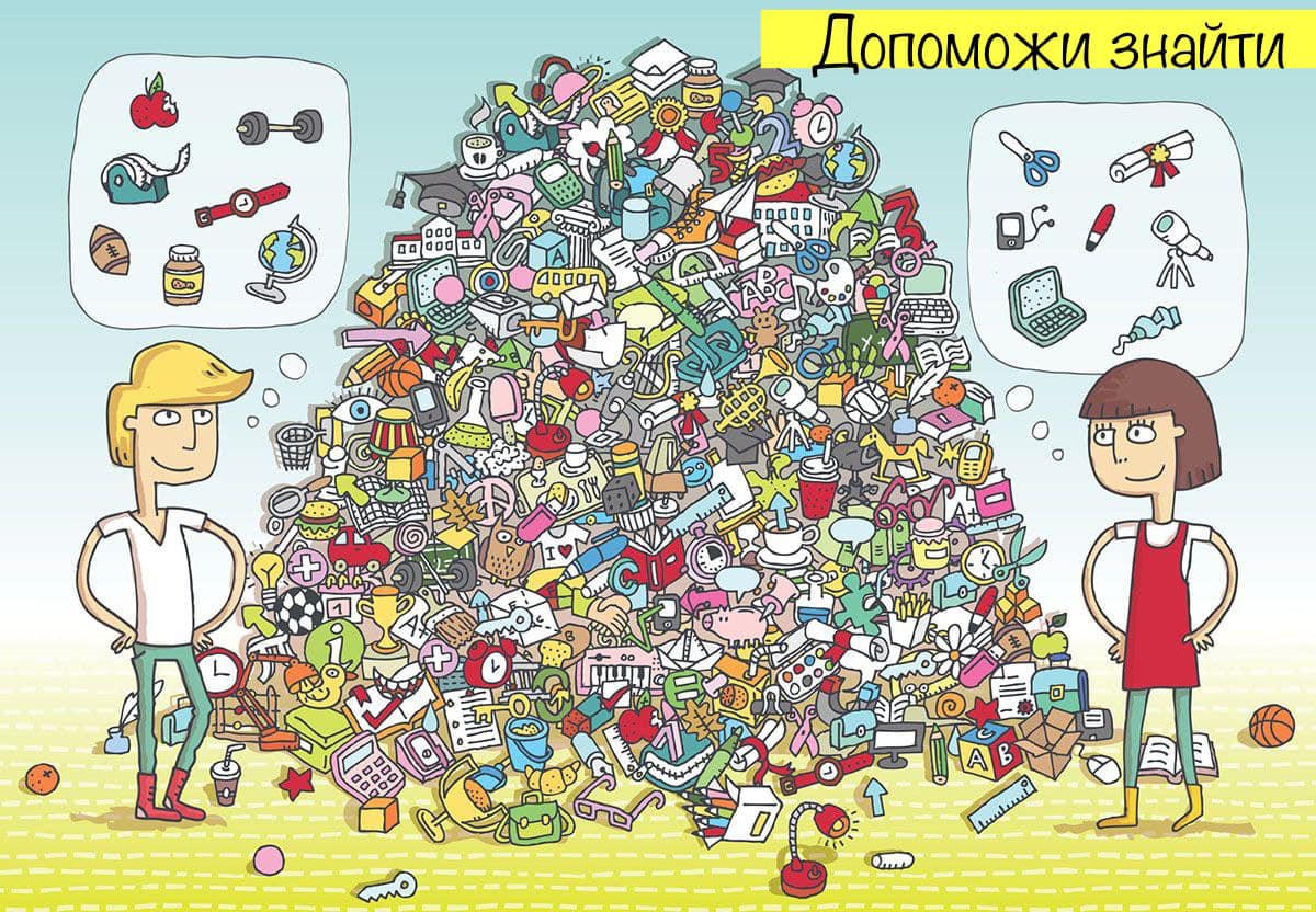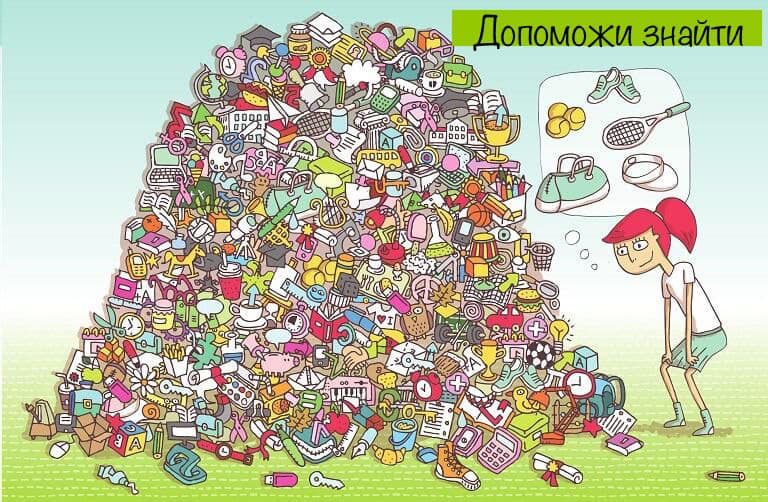 Запропонуйте дитині знайти серед гори безладно розкиданих речей певні предмети. Пропонуйте такі завдання дітям старшого дошкільного та молодшого шкільного віку. Такі завдання також будуть корисні і для дорослих