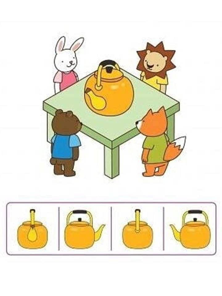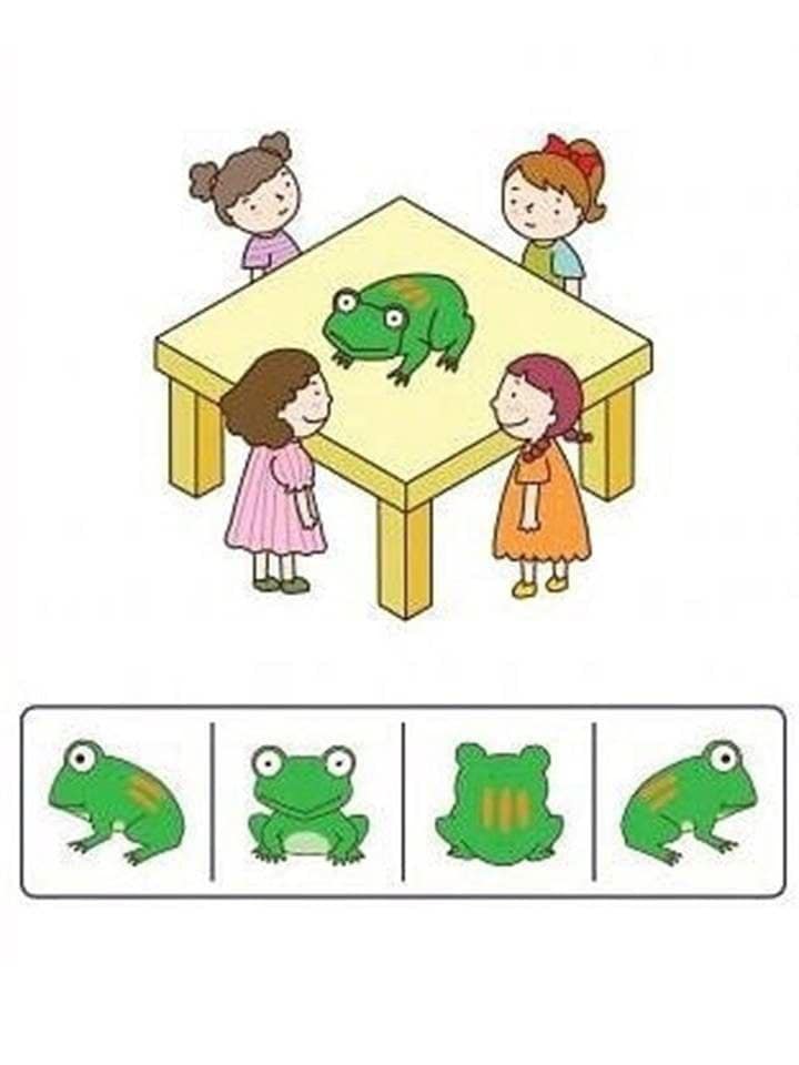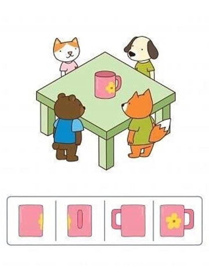 Запропонуйте дитині розглянути певний предмет (чашку, іграшку, книгу) з різних сторін та зверніть її увагу на зміни, які відбуваються. При цьому не слід рухати та повертати сам предмет, а нехай дитина переміщається навколо нього. Після цього пограйте разом в гру «Хто як бачить?», нехай дитина спробує поглянути на предмет, зображений на малюнку по різному, так би мовити очима різних героїв. Якщо у дитини виникають труднощі під час виконання завдання, поверніться до реального предмету в полі зору дитини.