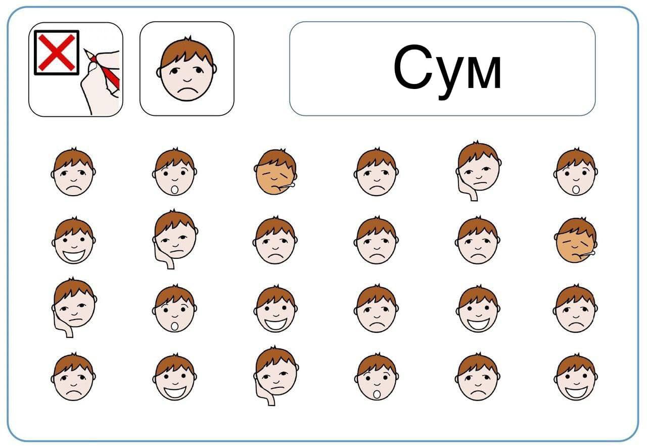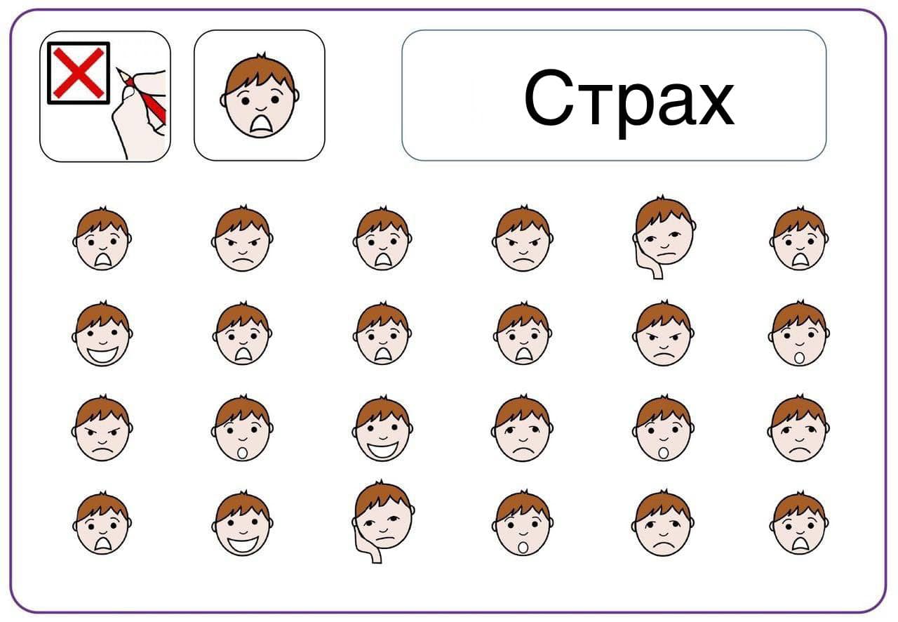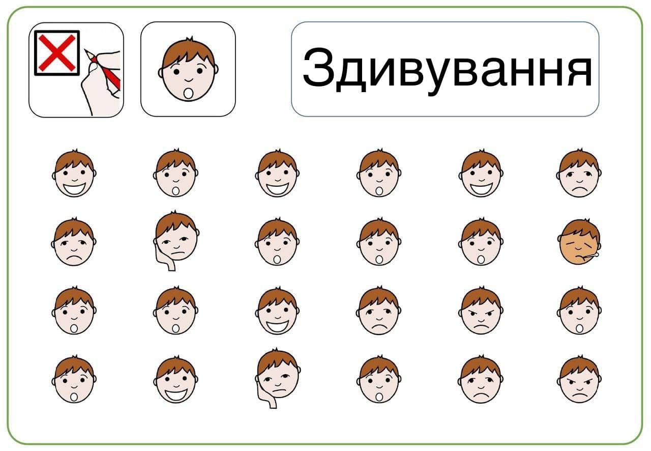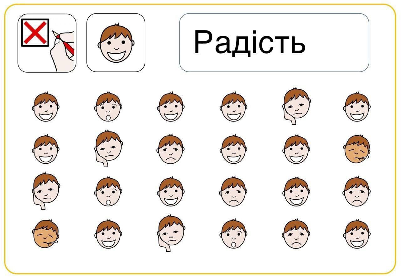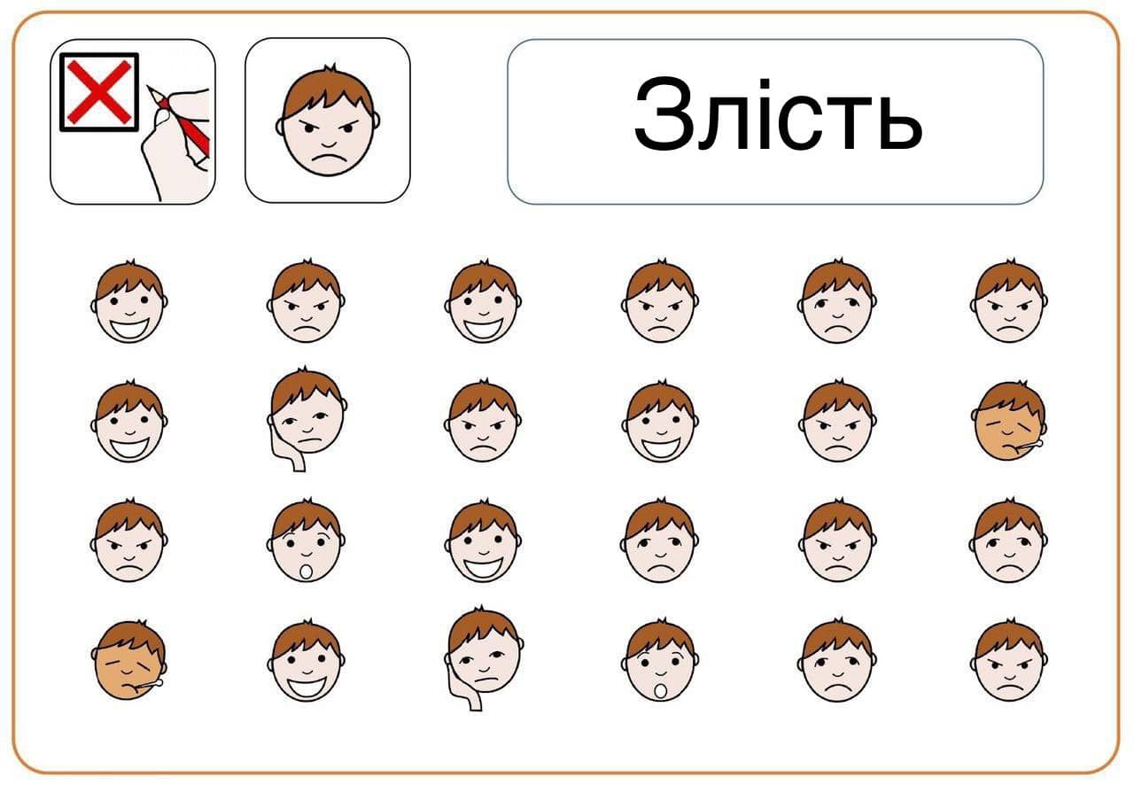 Розвиток уваги «Емоції» Запропонуйте дитині закреслити усі зайві зображення, залишивши лише обрану емоцію. Поширити