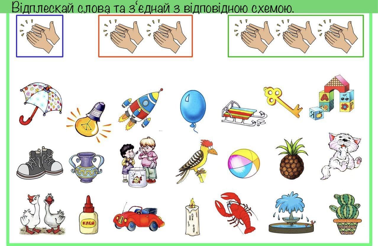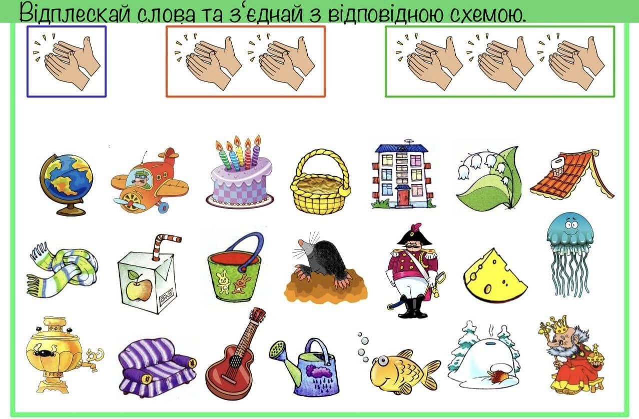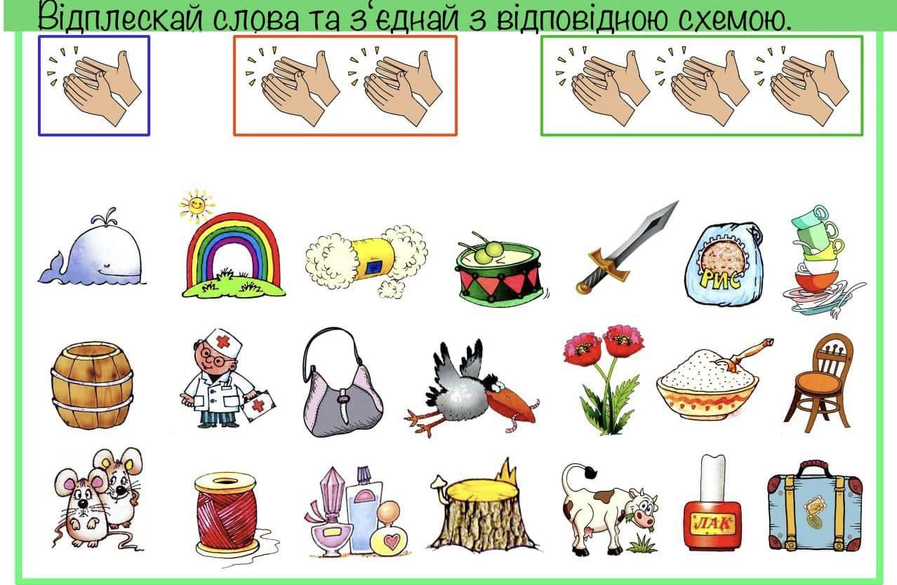 Запропонуйте дитині поділити слова на частинки, плескаючи в долоні на кожен склад та з’єднати картинки з відповідною схемою. Часто діти помиляються, відокремлюючи приголосні звуки під час поділу слів на склади. Щоб уникнути цього слід пропонувати дитині дещо проспівати слово, таким чином дитина навчиться правильно ділити слова на склади та практично засвоїть поняття про те, що у слові стільки складів, скільки у ньому голосних звуків.