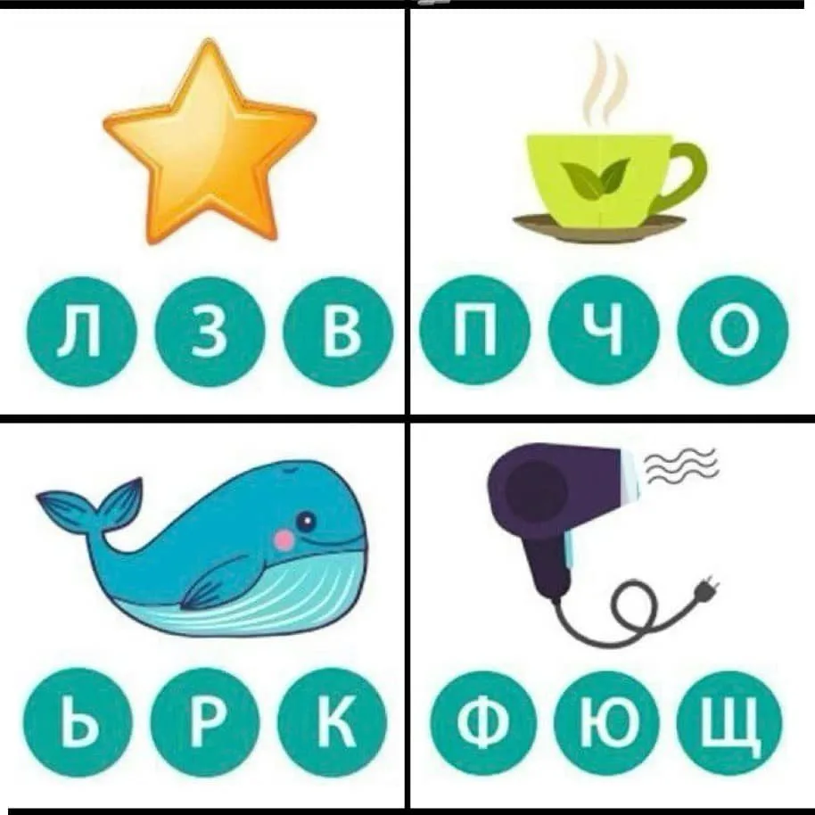 Запропонуйте дитині назвати картинки, визначити перший звук у слові та підібрати відповідну букву. В цю гру можна грати з декоративними прищіпками, паралельно включаючи в роботу пальчики та розвиваючи дрібну моторику.